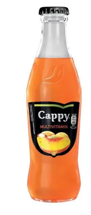 Dodáváme po 24ks. Vratná záloha sklo + basa 98Kč. Vícedruhový ovocný nápoj z koncentrátu s přidanými vitamíny. Obsah ovocné složky nejméně 50 %. Pasterizováno. Složení: ovocné šťávy a pyré z koncentrátu: pomerančová šťáva (40%), jablečná šťáva (5%), citronová šťáva (2,7%), hroznová šťáva (1,8%), broskvové pyré (0,8%), voda, cukr, vitamíny: niacin (B3), E, kyselina pantothenová (B5), A, B6, aroma.