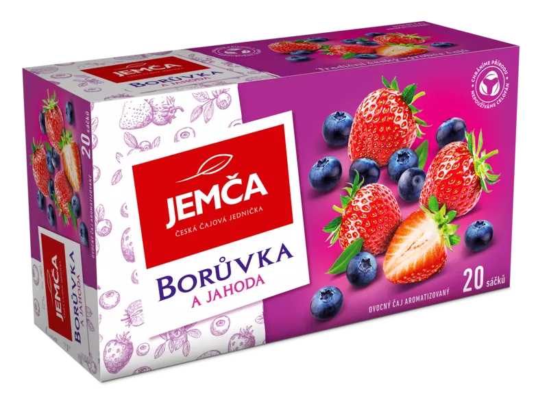 Borůvka a jahoda 40 g, ovocný čaj aromatizovaný (porcovaný v nálevových sáčcích). Složení: jablečná dužina, květ ibišku súdánského, borůvkové aroma (včetně koncentrovaného borůvkového džusu), list ostružiny, jahoda 1 %, borůvka 1 %, jahodové aroma (včetně koncentrovaného jahodového džusu), šípky. Ovocný čaj s chutí, vůní a barvou čerstvých borůvek a jahod.