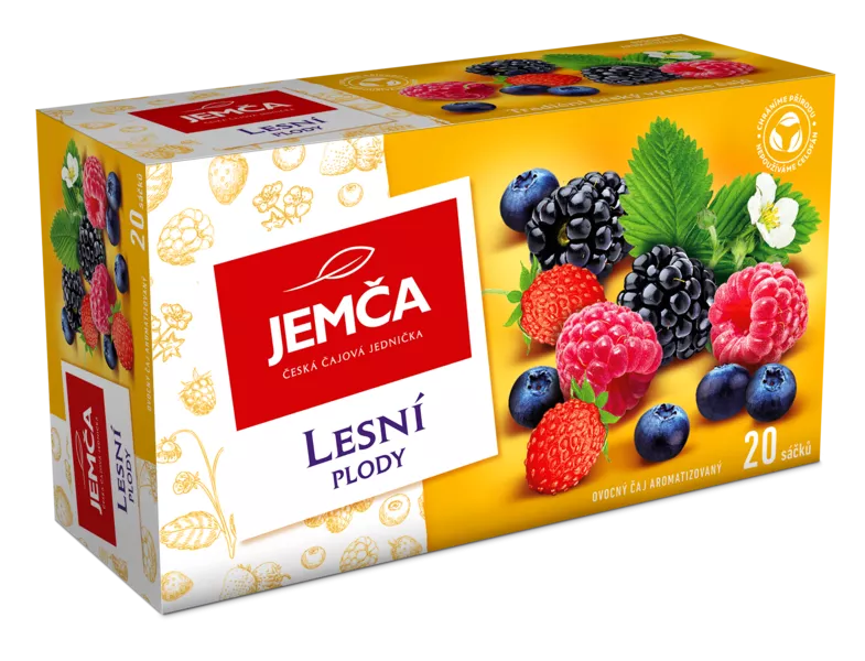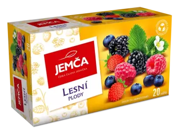 Jemča Lesní plody ovocný čaj 20 x 2 gLesní plody 40 g, ovocný čaj aromatizovaný (porcovaný v nálevových sáčcích). Složení: jablečná dužina, květ ibišku súdánského, jahoda 5 %, malina 5 %, kyselina citronová, vanilkové aroma, šípky, pomerančová kůra, dužina černého rybízu, ostružina 0,5 %, borůvkové aroma, malinové aroma, aroma, borůvka 0,1 %. Pro svoji jemnou a přitom výraznou chuť i vůni po lesních jahodách, malinách a ostružinách patří mezi nejoblíbenější ovocné čaje. V chlazené formě lze tento čaj doporučit zejména v letním období.