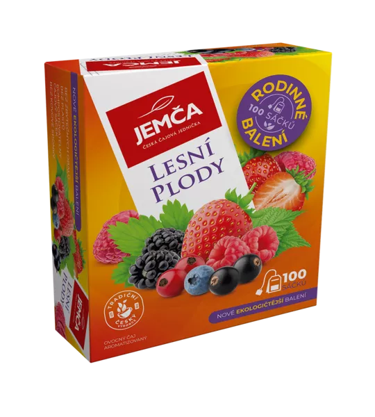 Lesní plody 200 g, ovocný čaj aromatizovaný (porcovaný v nálevových sáčcích bez hygienického přebalu a bez kovové sponky). Složení: jablečná dužina, květ ibišku súdánského, jahoda 5 %, malina 5 %, kyselina citronová, vanilkové aroma, šípky, pomerančová kůra, dužina černého rybízu, ostružina 0,5 %, borůvkové aroma, malinové aroma, borůvka 0,1 %. Váš oblíbený ovocný čaj Lesní plody v novém, unikátním balení - modernější, ekologičtější a hlavně úspornější. V balení najdete 100 ks sáčků se šňůrkou a etiketou, bez přebalu, bez kovové sponky. Čajové sáčky jsou plně kompostovatelné, balení je zcela bez plastů a bez dalších nadbytečných obalů.
