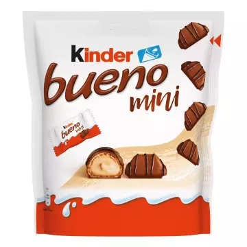 Kinder bueno Oplatka mini 108gOplatka s polevou z mléčné čokolády a s mléčnou a lískooříškovou náplní. Složení : MLÉČNÁ čokoláda 31 % (cukr, kakaové máslo, kakaová hmota, odtučněné sušené MLÉKO, MÁSELNÝ tuk, emulgátor: lecitiny (SÓJOVÉ); vanilin),Cukr,Palmový olej,PŠENIČNÁ mouka,LÍSKOVÉ OŘÍŠKY (10,8 %),Odtučněné sušené MLÉKO,Plnotučné sušené MLÉKO,Čokoláda (cukr, kakaová hmota, kakaové máslo, emulgátor: lecitiny (SÓJOVÉ); vanilin),Kakaový prášek se sníženým obsahem tuku,Emulgátor: lecitiny (SÓJOVÉ),Kypřicí látky (E 500ii, E503ii),Jedlá sůl,Vanilin,Obsah mléčné sušiny: nejméně 19,4 % z celkové hmotnosti. Alergeny : obiloviny obsahující lepek,Sójové boby a výrobky z nich,Mléko a výrobky z něj (včetně laktózy),Skořápkové plody a výrobky z nich.