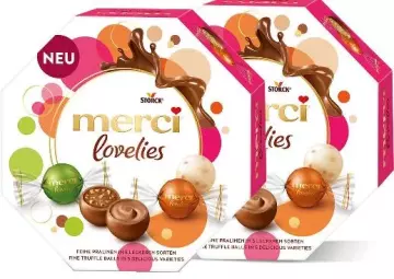 Dárková krabička se 14 jednotlivě balenými čokoládami. 5 druhů. Složení: Cukr, kakaové máslo, sušené plnotučné mléko, kakaová hmota, kokosový tuk, lískové ořechy (4,5 %), zahuštěný máselný tuk, sušené podmáslí, sušené odstředěné mléko, mléčný cukr, pšeničná mouka, sekané mandle (1,1 %), emulgátor lecitin (sója), fruktóza, aromata, sůl. Alergeny : Obiloviny obsahující lepek,Jádra podzemnice olejné (arašídy) a výrobky z nich,Sójové boby a výrobky z nich,Mléko a výrobky z něj (včetně laktózy),Skořápkové plody a výrobky z nich. VÝŽIVOVÉ ÚDAJE/JEDNOTKA: Výživové hodnoty na 100 g: Kalorická hodnota: 602,00 kilokalorií (kcal) Kalorická hodnota: 2 504,00 kilojoulů (kJ) Tuky: 43,10 Tuky, z toho nasycené tuky: 27,70 Sacharidy: 44,50 Sacharidy, z toho cukr: 41,80 Bílkoviny: 7,50 Sůl: 0,29. Původ : Německo. Výrobce : Storck Česká republika, s.r.o., Sokolovská 100/94, 180 00, Praha 11